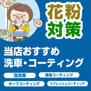 花粉対策コーティング洗車 当店のピットメニューでは、 半年コーティングから、1年・2年・3年持続タイプまで 幅広くラインナップ。特におすすめは、シミが付きにくい“親水タイプ”コーティング。愛車の美しさを長く...