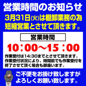 【3月31日】営業時間のご案内 3月31日(火)は誠に勝手ながら棚卸業務の為、10:00~15:00までの営業ピット作業受付は14:30までとさせていただきます。4月1日(水)以降は通常通り営業させていただきます...